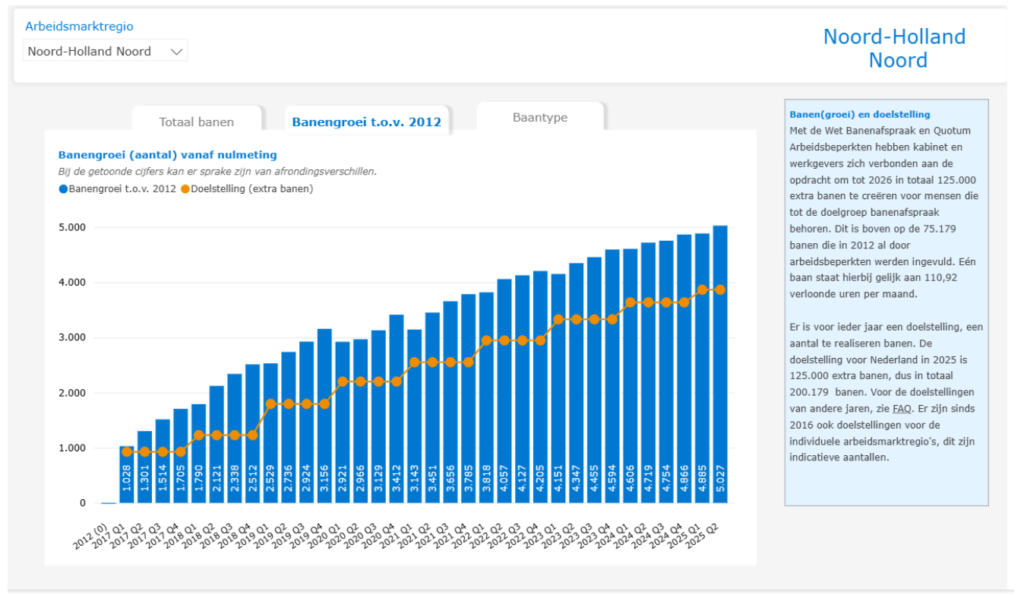 Volgens de cijfers uit Q2 2025 laat Noord-Holland Noord opnieuw een sterke stijging zien in de Banenafspraakresultaten. Sinds de nulmeting in 2013 zijn er 5.027 extra banen gerealiseerd, waarmee de regio ruim 30% boven de doelstelling presteert. De regionale doelstelling voor eind 2025 is 3.866 banen; dit betekent dat Noord-Holland Noord 1.161 banen vóór op de planning ligt.